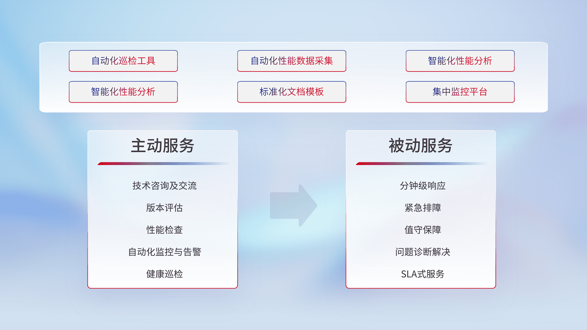 智能化工具和标准化文档,,保障服务质量,,,提供主动服务(包含技术咨询、、版本评估、、、、性能检查、、、、自动化监控与告警、、健康巡检)和被动服务包含(分钟级响应、、紧急排障、、、、值守保障、、、、问题诊断解决、、SLA服务)。。。