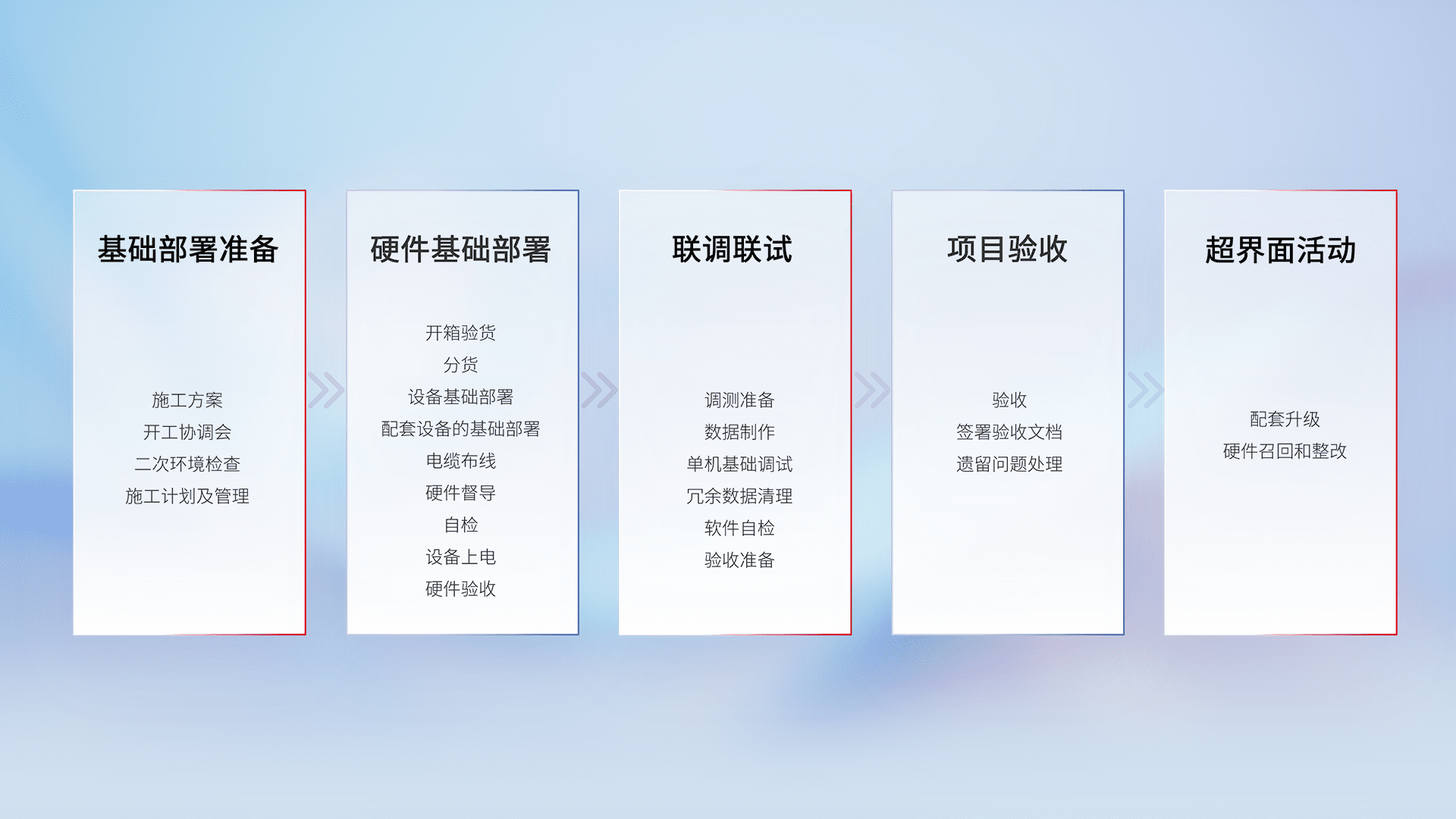 从基础部署准备、、、硬件基础部署、、、、联调联试、、、项目验收、、越界面活动的全过程可追溯,,保证施工质量和进度。。